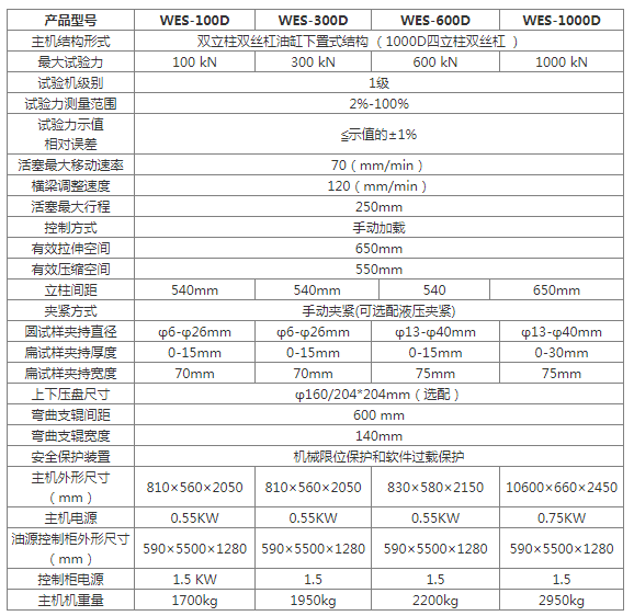 濟南試金WES-D數(shù)顯式液壓萬能試驗機主要用于金屬材料的拉伸、壓縮、彎曲等力學(xué)性能試驗,增加簡單的附件后可對水泥、混凝土、磚、瓦、橡膠及其制品進行檢測。