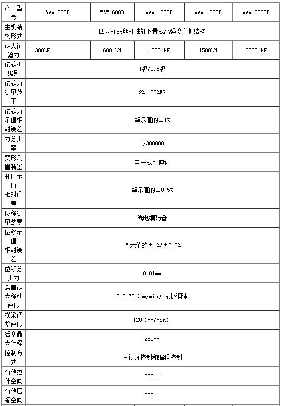 本機(jī)由四立柱雙絲杠油缸下置式高強(qiáng)度主機(jī)及琴式油源控制柜組成,油泵采用意大利馬祖奇進(jìn)口低噪音高性能齒輪泵。拉伸空間位于主機(jī)上方,壓縮、彎曲試驗(yàn)位于主機(jī)下方即中橫梁和工作臺(tái)之間。試驗(yàn)空間的調(diào)整通過移動(dòng)中橫梁來(lái)實(shí)現(xiàn),中橫梁升降采用鏈條傳動(dòng)。計(jì)算機(jī)全自動(dòng)閉環(huán)控制高性能電液比例伺服閥來(lái)完成對(duì)各種材料的拉伸、壓縮、彎曲等試驗(yàn)。試驗(yàn)完成以后自動(dòng)采取材料的FM、REH、REL、RPO.2、RP1、RM和彈性模量E等實(shí)驗(yàn)結(jié)果。